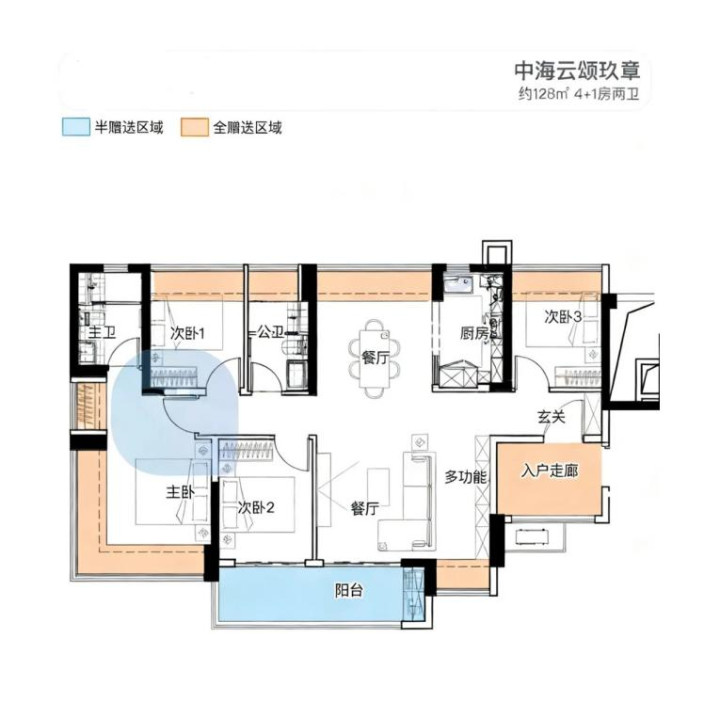 建面约128㎡4+1房两卫,横厅设计,南北通透,自带入户走廊,户型敞阔。
