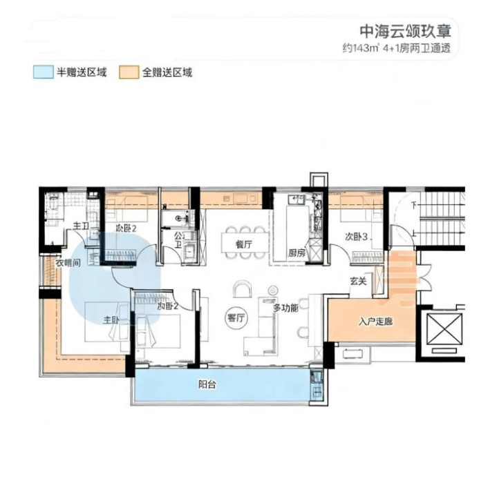 建面约143㎡4+1房两卫,全明通透,主卧配独立衣帽间,客厅、次卧连通南向大阳台,改善需求一步到位。